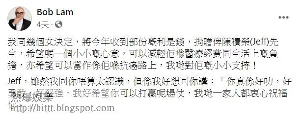 Bob亦有轉載陳積榮的情況,並捐出金錢相助。