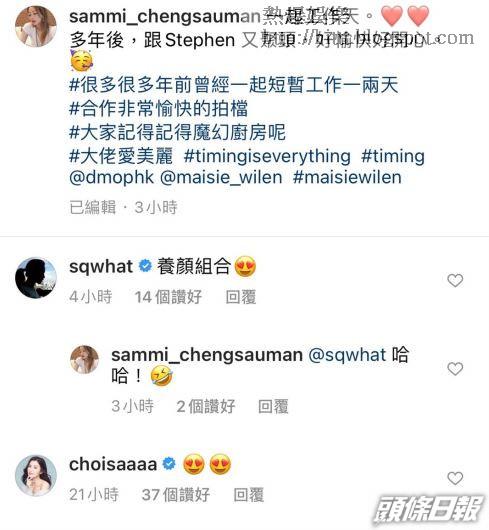 48歲鄭秀文(SAMMI)和46歲馮德倫曾合作拍04年的《魔幻廚房》及《大佬愛美麗》,但對手戲唔算多。近日兩人相隔17年再合作,鄭秀文在社交網分享合照,雖然馮德倫已滿臉白鬍鬚但仍然靚仔仲增添幾分滄桑佬味,鄭秀文留言說:「一起工作天。多年後,跟Stephen又聚頭,好愉快好開心。」hashtag係#很多很多年前曾經一起短暫工作一兩天#合作非常愉快的拍檔#大家記得記得魔幻廚房呢#大佬愛美麗」,而馮德倫老婆舒淇亦留言指他們是「養顏組合」,○氹到SAMMI哈哈笑。