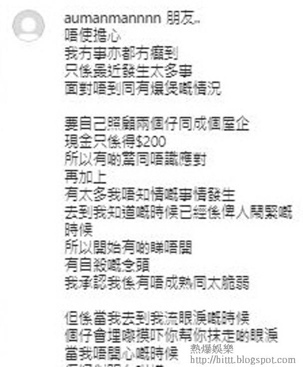她更自爆現在手上只得200元現金:「要自己照顧兩個仔同成個屋企,現金只係得$200,所以有啲驚同唔識應對。」又自爆曾經有輕生的念頭,幸好及時回頭是岸,未有發生悲劇,她說:「有太多我唔知情嘅事情發生,去到我知道嘅時候已經係畀人鬧緊嘅時候,所以開始有啲睇唔開,有自殺嘅念頭。我承認我係有唔成熟同太脆弱,但係當我去到我流眼淚嘅時候,個仔會埋嚟摸吓你幫你抹走啲眼淚。當我唔開心嘅時候,佢好似明白咁樣,過嚟拍下你摸吓你嗲吓你,嗰一刻我先醒覺,我唔可以放棄,因為我冇權帶走佢哋嘅生命。嗰一刻我同自己講我一定要堅強,要努力面對一切,先可以陪伴到佢哋去佢哋之後嘅人生。」