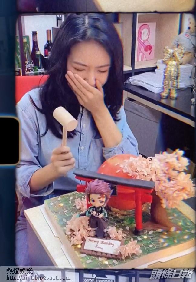 蛋糕外觀相當精美,當中有一個紅色的「揼揼蛋糕」,加上鳥居和花瓣,上面再有一個動畫主角炭治郎Figure,充滿心思。短片可見,Joey揼碎蛋糕外層,裡面原來是一個士多啤梨朱古力蛋糕,過程中她雙眼發光,更不斷驚嘆:「好靚呀!」,充滿童真,龔嘉欣與麥明詩都有留言祝賀Joey。