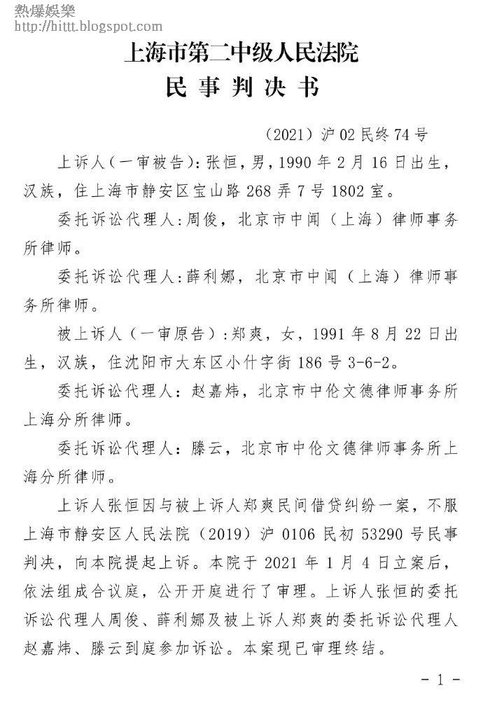 據大陸傳媒指,鄭爽與張恒的「借貸糾紛」案二審在本月22日於上海二中院開庭,張恒雖在二審時提供了20項證據,而當中更有張恒在美國的出入境記錄及其護照信息,但經法院審理後,認為張恒是否有幫鄭爽賺錢、鄭爽是否需要向張恒支付報酬或分紅等均與本案無關,而張恒的證據亦不能推翻他與鄭爽的「借貸關係」,故法院今日就推翻張恒上訴,維持原判。