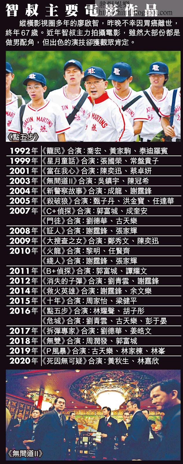 廖啟智於1979年入讀無綫第八期藝員訓練班,之後被安排演出多部劇集如《上海灘》、《飛越十八層》、《薛仁貴征東》及《包青天》,另外亦有參與《歡樂今宵》及《城市追擊》的主持工作。在劇集中智叔多演配角,但憑着出色演技深受觀眾認識及支持,除了無綫外,智叔亦拍過有線及香港電視的劇集,當中《選戰》贏得不少口碑。其間智叔也有參與電影拍攝,先後於1993年憑《籠民》和2009年《證人》兩度獲香港電影金像獎最佳男配角,因而贏得行內「黃金配角」美譽,他近年在浸會大學電影學院任講師及教學顧問。