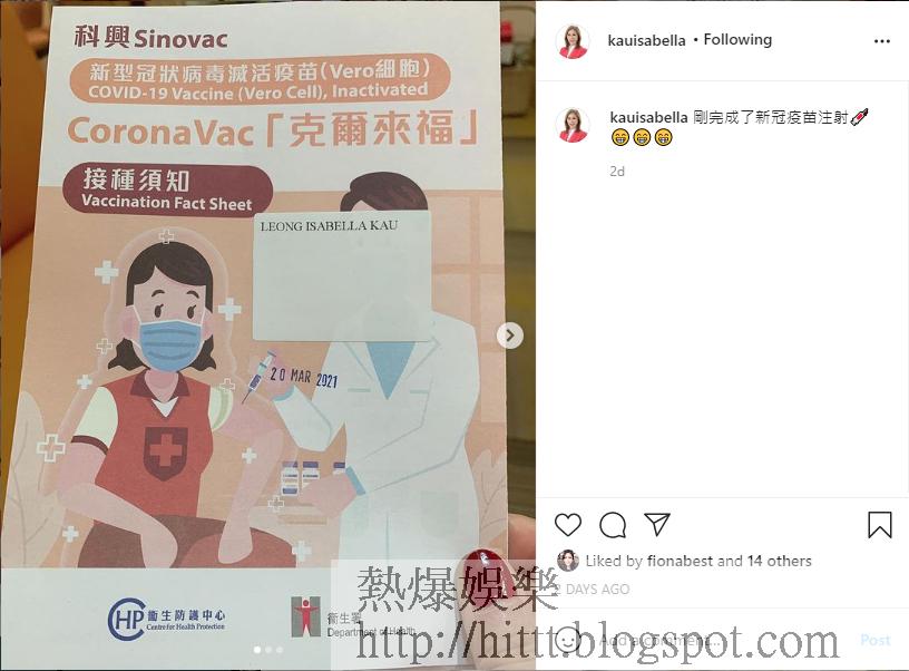 近日全城關注的2019冠狀病毒病疫苗接種計劃,政府於上星期將優先組別擴展至30至59歲人士,而剛好踩界、現年59歲的寇鴻萍前日在IG透露自己接受疫苖注射,還公開自己打的是國產貨科興,寇鴻萍打完針後與家人慶祝生日,同晚再與細女去戲院睇戲,看來她真的對疫苗很有信心。
