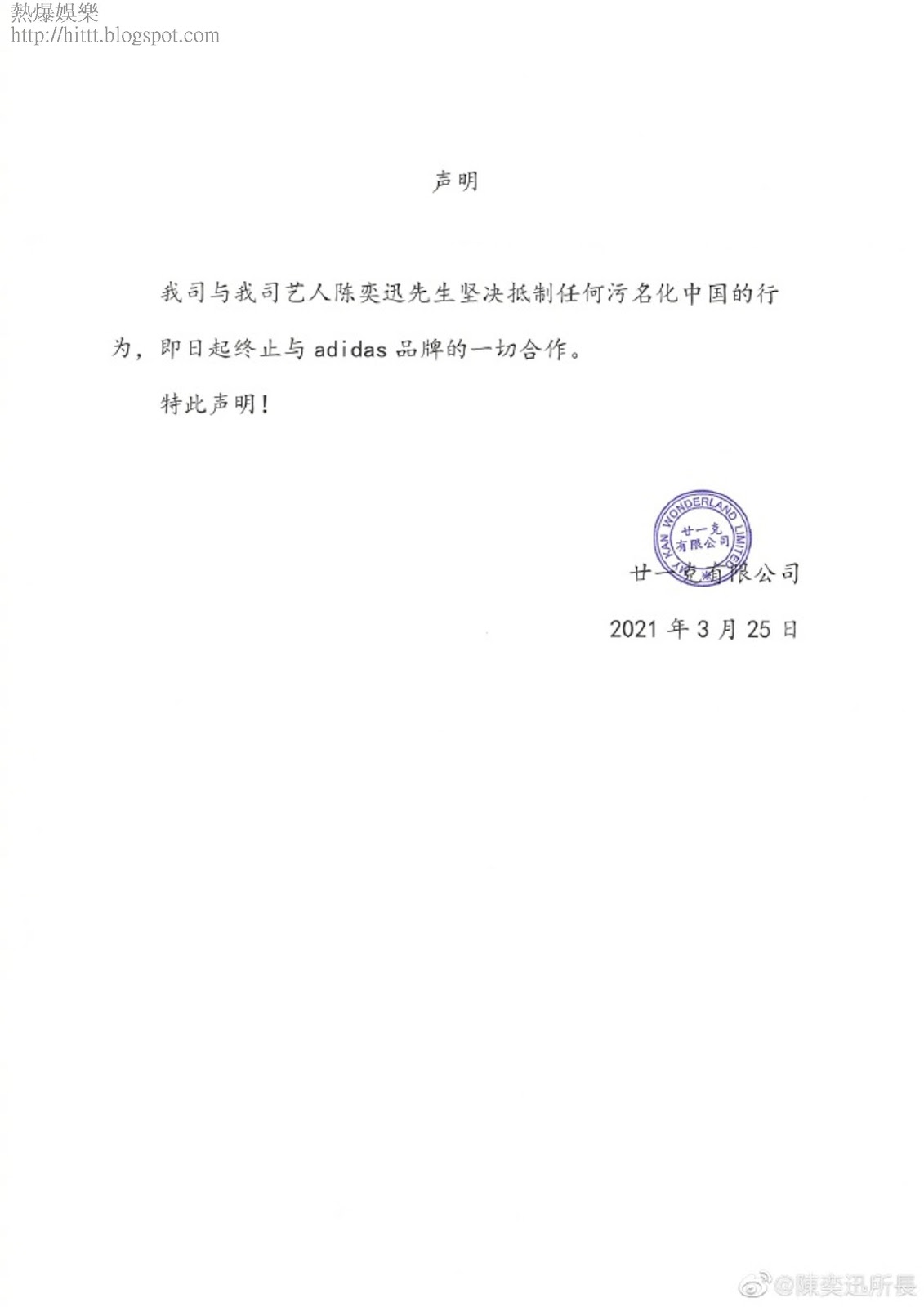 有中國代表指,明星因支持新疆棉解約沒有賠償的責任,難道護棉手就不需要履行合約精神?根據合約精神,相方在合約上都有不同條款要遵守,而只要有人違非了這些條件,雙方都可以單方面宣佈解約,沒需要賠償對方。現在一大堆大陸、香港明星以品牌「抹黑國家」為理由,單方面解約,似乎是無後顧之憂之舉。不過,有消息指陳奕迅因新疆棉風波而與adidas 終止合約一事,將需要面對賠償6000萬元違約金,未知是否因為合約是「全球代言人」而非「中國代言人」而有不同的條款,縱使如此,不少品牌如Hugo Boss 和ASICS等,已重申「不能容忍強迫勞動」,更強調沒有採用新疆棉,「新疆棉」渲染着「有違人權與道德」的嫌疑,中方是否被抹黑仍有待商榷,所以違約賠償的說法仍然不能否定。看來名人要抵制品牌這一套,還是留給無約在身的人吧。
