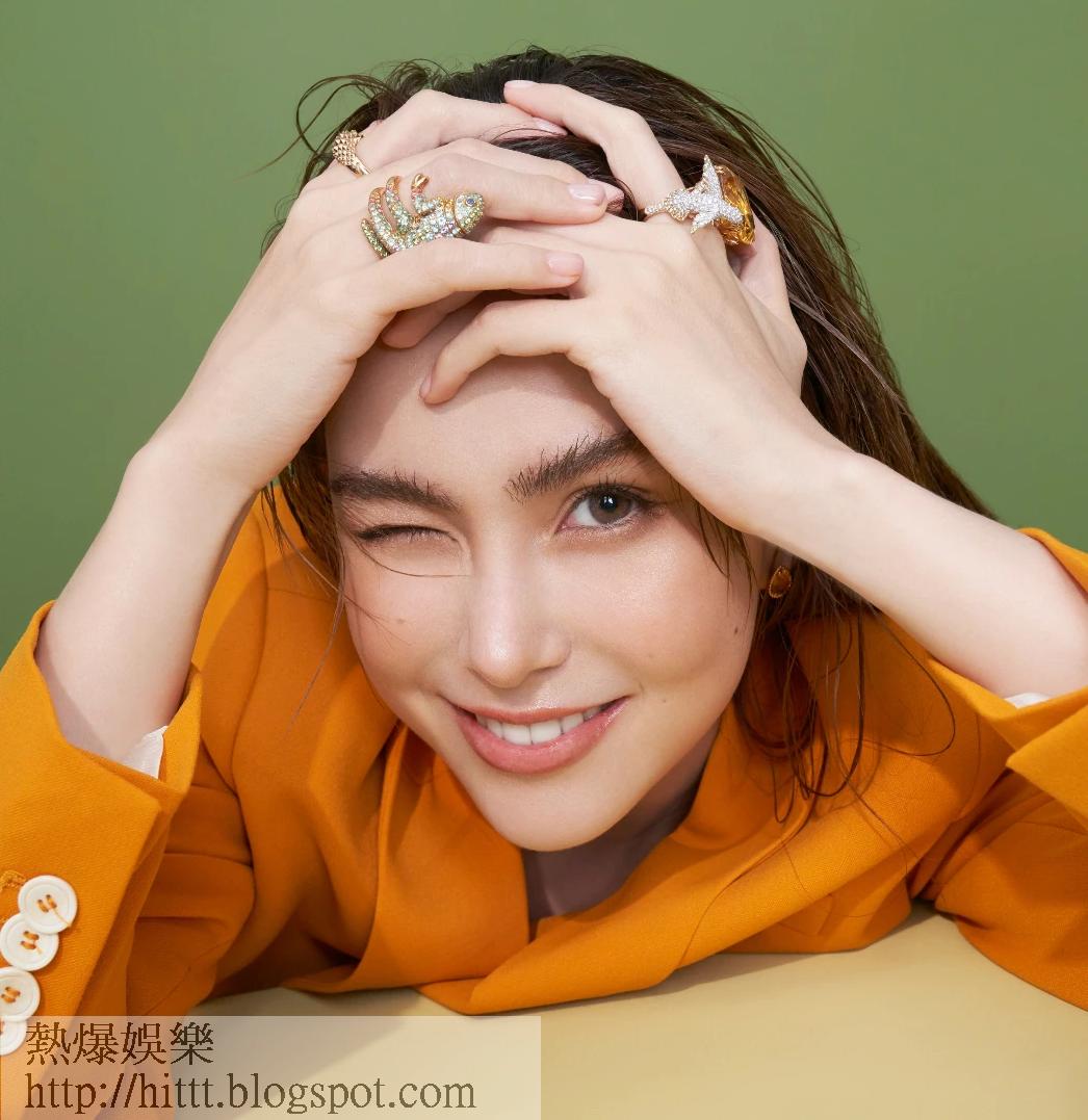 昆凌着上橙黃色西裝外套搭配紅色皮裙,裏面單穿杏色bar top,露出平坦的腹部,更有少少腹肌線條,完全不像是兩個小朋友的媽媽,型格中帶點小性感。她戴上品牌Animaux動物系列的Hopi蜂鳥、Hans刺蝟及Masy變色龍戒指,色彩繽紛,高貴又不失趣意,昆凌特別擺出俏皮可愛的表情,魅力十足。