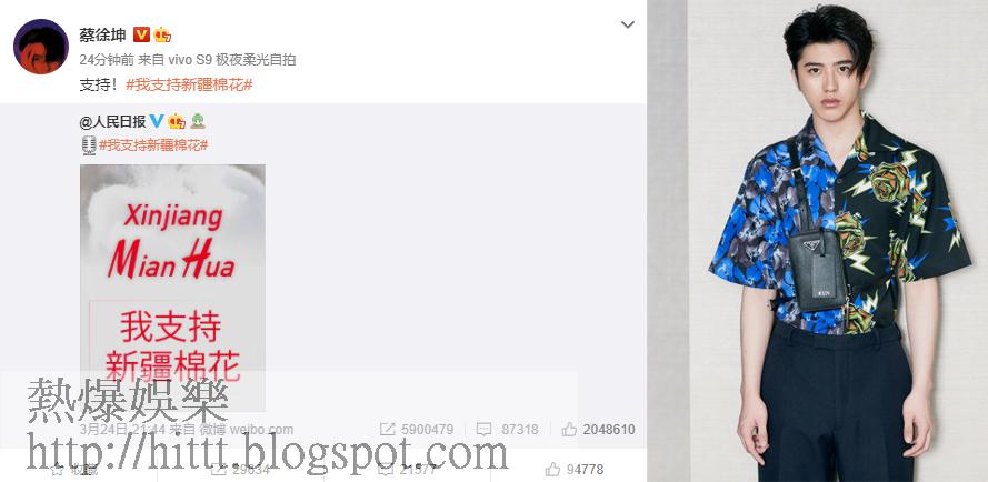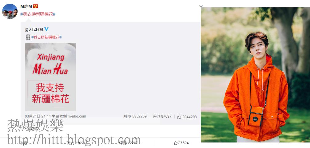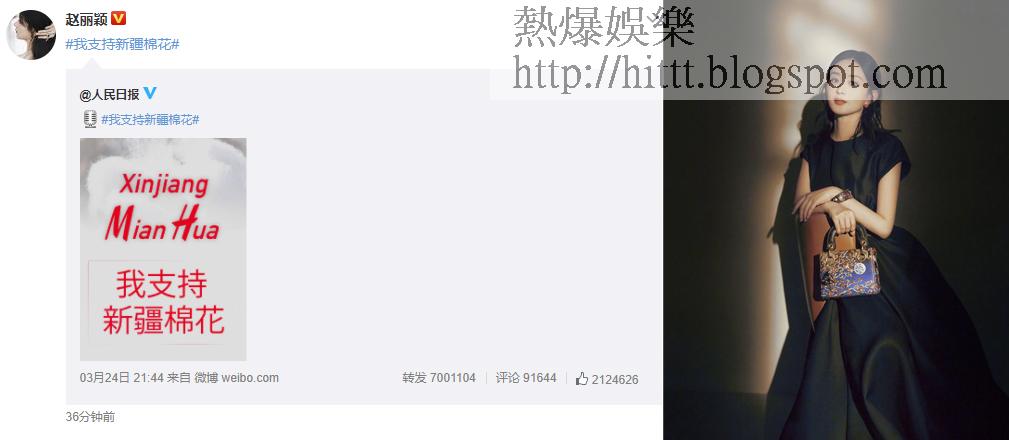 中國官媒《人民日報》隨即發起#我支持新疆棉花轉發活動,並以H&M品牌Logo的字體製做圖片,至今已獲超過640萬次轉發,明星們當然馬上展現「愛國情操」,多位紅星紛紛轉發表態,包括Gucci代言人鹿晗、Longchamp代言人王子文、Prada代言人蔡徐坤及Dior品牌大使趙麗穎等,相信若其代言的品牌被拖下水,為表愛國心他們也會火速割席。內地女星郁可唯更貼出自己穿着李寧牌的照片,大讚「帥呆了我大國貨,我大李寧!!!」非常懂得「擦鞋」。