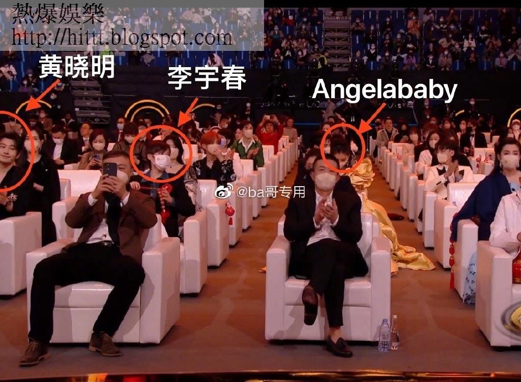 黃曉明跟baby前後排坐,中間仲要隔著李宇春、趙麗穎。(網上圖片)