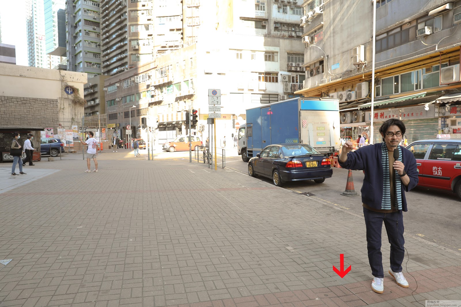 去到巧明街AIA大樓,黃修平教各人分辨「公眾地方」與「私人地方」的界線,他說︰「究竟邊啲位置係屬於私人?邊啲位置係屬於公家?係好弔詭,例如你見到面前呢條路,你當然會覺得,呢段咁靚先係私人,原來唔係。」拍攝當日保安指,大廈對出近20呎的地方都屬於商廈範圍,要先申請才可以拍攝。
