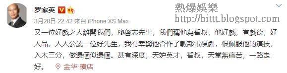 正身在橫店拍戲的羅家英,早前面對舊拍擋吳孟達病逝後,昨晚再得知智叔離世,難免倍添傷感,家英哥撰寫長文表揚智叔「又一位好戲之人離開我們,廖智叔先生,我們稱他為智叔,他好戲、有戲德、好人品,人人公認一位好先生,我有幸與他合作數部電視劇,很佩服他的演技,入木三分,做邊個似邊個。甚有深度,天妒英才,智叔,天堂無痛苦,一路走好。」
