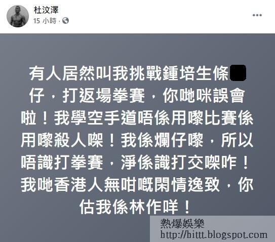 見雙方火藥味濃烈,於是有人建議杜汶澤也跟鍾培生打一場。不過,杜汶澤指自己學空手道並非作比賽用途,而是用於殺人,又稱自己為「爛仔」,不會打拳賽,只會打架!更稱香港人並非林作,沒閒情逸緻陪鍾培生。