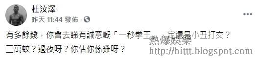 杜汶澤對於門票售價有意見,並出POST說:「有多餘錢,你會去睇有誠意嘅《一秒拳王》,定還是小丑打交?三萬蚊?過夜呀?你估你係雞呀?」