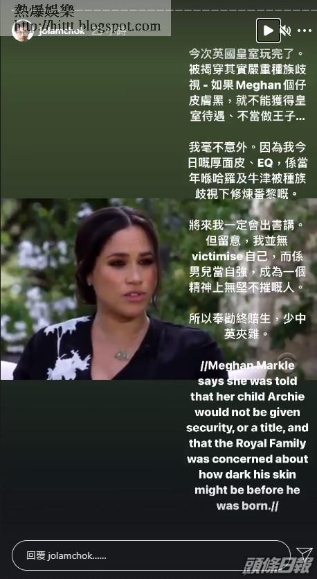 另外,林作昨日於IG限時動態貼出前皇室成員哈利和梅根的受訪片段,當中梅根提到皇室存在種族歧視問題。過往曾於英國牛津大學讀書的林作感同身受,坦言自己當年亦試過被種族歧視,所以對此並不感到意外,又指自己有今日的厚豆皮和高EQ,全是當年在哈囉及牛津被種族歧視下修煉出來的,他又表示將來一定會出書提及此事。