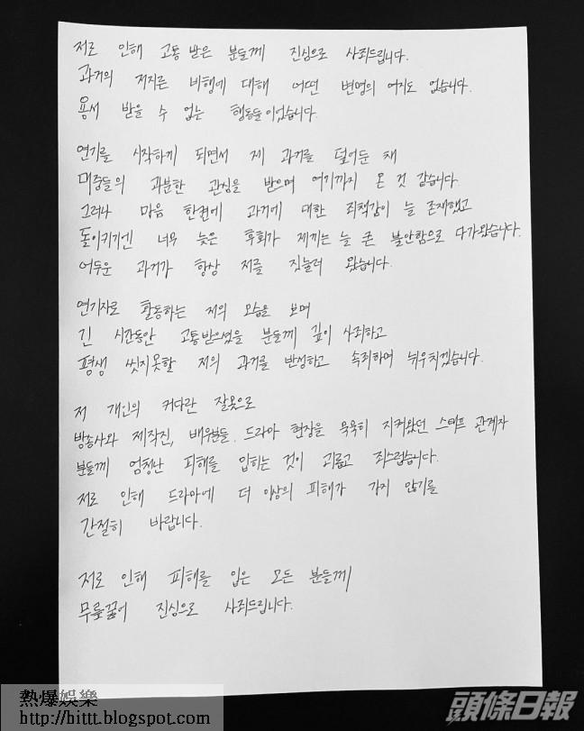 今早,志洙在社交網發親筆信道歉,直接承認傳聞。他表示:「真心向因為我而感到受苦的所有人道歉,對於過去的惡行,我沒有任何藉口,那是不能被原諒的行為。我隱瞞過去出道,得到大家的喜愛才能走到現在。但我內心一直都對過去的事感到愧疚,要反省檢討或是懺悔都太遲了。我一直都很不安,陰暗的過去總是壓迫著我。這段時間看著以演員身分活動的我而感到痛苦的人們,我致上最深的歉意,我會一輩子反省這段無法抹掉的過去。」