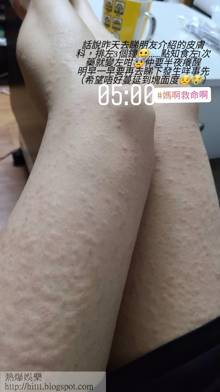 有「東張咪神」之稱的TVB藝人利穎怡上周五(5日)在IG貼出驚嚇相,見她一對玉腿長滿密密麻麻、類似風赧的紅疹,由大腿到小腿有近百處,因為痕癢甚至在半夜紮醒。她透露出紅疹之前曾看過皮膚科及食藥,懷疑與藥物有關。