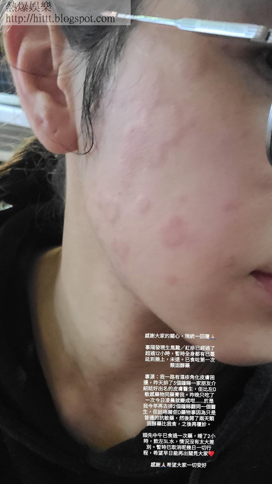 利穎怡服用類固醇藥後再短暫休息兩小時,但情況未有太大改善,無奈要暫停幾日工作。不過休息數日,利穎怡仍未更新近況,令人擔心,有網民就祝她早日康復。