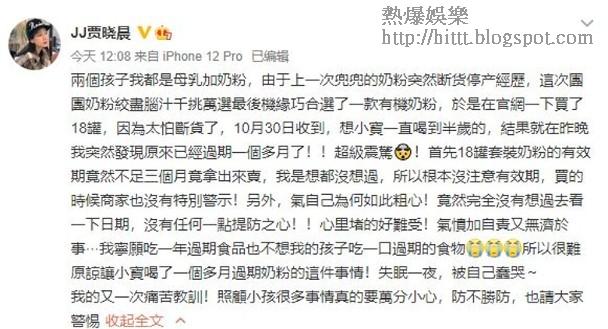 藝人賈曉晨(JJ)早前為老公樊少皇誕下細女「小飯團」,轉眼細女已經半歲大,肥肥白白好可愛。惟今日JJ在社交網自爆讓細女誤飲了過期奶粉,鬧爆商家無良兼難受自責:「我寧願吃一年過期食品,也不想我的孩子吃一口過期的食物!」JJ指由於大女「小飯兜」的奶粉突然斷貨停產經歷,故這次為「小飯團」提早囤貨,在網上購買兩套9罐set裝,總共18罐,去年10月30日收貨,希望小寶一直喝到半歲。
