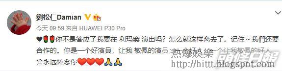 而艾威亦表示:「智叔是一個擁有高尚情操的藝人,能成為他的好友,是我的榮幸。」劉松仁及林保怡亦有發文悼念,前者說,「你不是答應了我要在利瑪竇演出嗎?怎麼就這樣離去了。記住~我們還要合作的。你是一個好演員,讓我敬佩的演員:一個好人,一個讓我敬佩的好人。會永遠懷念你。」而後者就簡單地說,「智叔,一路走好。」