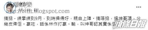 一向愛抽水炒作的林作當然唔會放過曝光機會,他在Facebook轉發報道,並留言:「搞掂!練拳練到9月,到時操得好,親自上陣。搞唔掂,搵坤哥頂,分幾皮俾佢。贏咗,話係林作打贏。輸,叫坤哥認其實係佢。」之後有網民為坤哥平反,指佢比林作好好多,希望佢睇到會開心返。