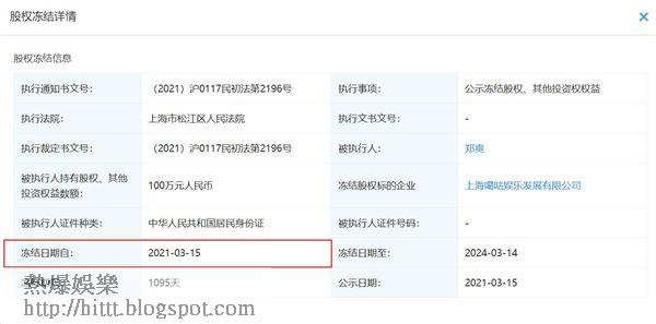 此外,昨日有報道指鄭爽獨資的上海噶咕娛樂發展公司,在3月15日被上海人民法院公告凍結股權3年,被凍結的股權金額為100萬人民幣(約120萬港元),鄭爽的公司在3年內禁止營業。