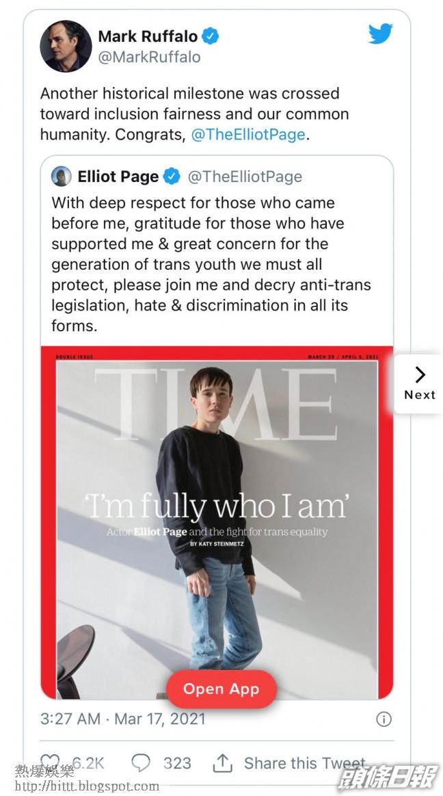 電影《潛行凶間》及劇集《雨傘學院》的加拿大演員愛倫比芝(Ellen Page)於2014年出櫃,去年12月宣佈成為一名誇性別人士,並改名為Elliot Page。近日,Elliot更成為首位登上《時代》雜誌封面的跨性別人士,訪問中還透露已進行切除乳房的手術。