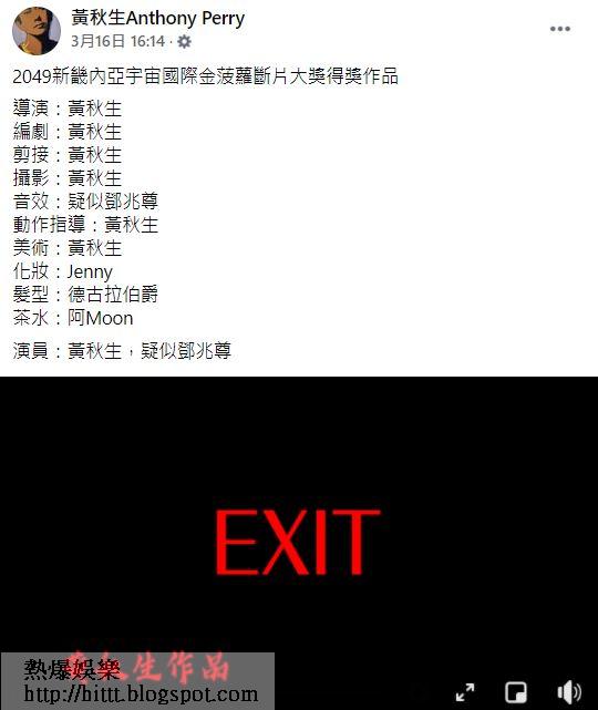 黃秋生本月初回港,在酒店完成14日隔離,接着開工拍攝「2049新畿內亞宇宙國際金菠蘿斷片大獎得獎作品」,片名為《EXIT》。故事在一幢工廠大廈後樓梯發生,戴住太陽眼鏡的黃秋生自拍,神情有點徬徨,左顧右盼似為自己搵出路,往上行了兩三層樓後,已顯得有點力不從心,可幸再往上走終於見到有同路人。此時他面容顯得踏實,走到一間寫字樓外按鐘。出來應門是「啱channel」的蝦條哥,他邊開門邊話︰「入嚟啦」,即時被黃秋生笑罵︰「你應該問我搵邊個先係……唔怪得之你拍嘢咁樣……我搵鄧兆尊呀,X你。」秋生入內後短片亦完結,片長約1分46秒。