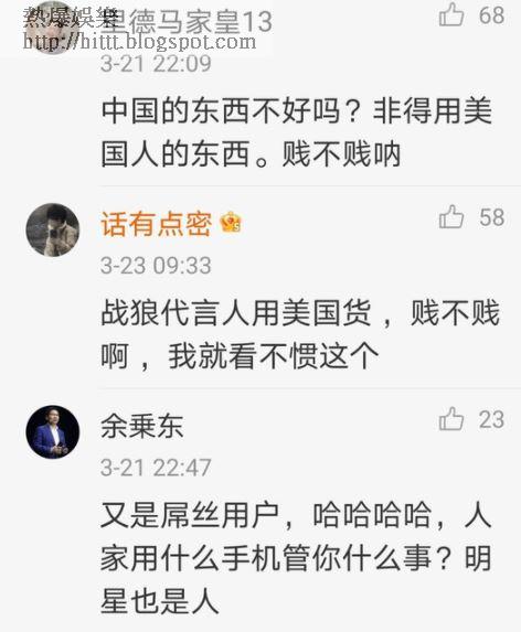 吳京身為演藝界「戰狼」代表,日前卻被大陸小粉紅圍攻,原因是吳京連日在微博出post,被小粉紅發現竟然用美國品牌蘋果iPhone 12 Pro Max,有大陸網民直斥吳京:「你為甚麼不用華為?你是不是不愛國?」有網民質疑他:「這裏是中國,不用華為就滾回你的美國去,用美國人的手機行,用中國人的就不行,賤不賤啊!」另有小粉紅說:「戰狼代言人用美國貨,賤不賤啊,我就看不慣這個!」