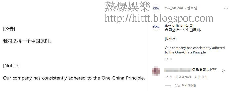 今年成軍7年的韓國女團MAMAMOO一向走實力路線,四位成員早前傳出不續約所屬RBW事務所,不過RBW昨日表示頌樂、玟星及華莎已先後續約,目前尚欠輝人仍未續約,強調組合絕不會解散,預告MAMAMOO成功避過七年之癢。不過RBW事務所昨日又成為新聞話題,RBW昨日深夜突然在微博及IG上載公告,以中文及英文表示:「我司堅持一個中國原則。」即時引來各地網民的熱話。
