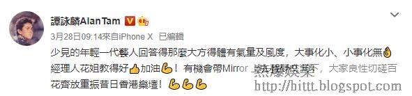 原來撐姜濤嘅不單係姜糖同有雪亮眼睛嘅觀眾,「樂壇校長」(a.k.a.樂壇燈神)譚詠麟都有睇報紙留意呢件事,佢喺微博出post讚姜濤同花姐,譚校長話:「少見的年輕一代藝人回答得那麼大方得體有氣(器)量及風度,大事化小、小事化無。經理人花姐教得好,加油!有機會帶Mirror上去《聲夢》交流下,大家良性切磋,百花齊放,重振昔日香港樂壇!」