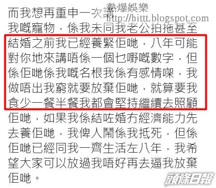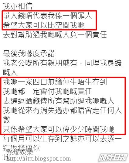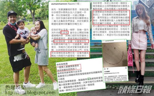字裏行間雯雯還替老公Steven求情,指「一個男人衰鹹濕衰貪玩,係咪就要判佢死刑?既然佢𠵱家咁努力去生存,點解唔可以畀啲時間佢,慢慢做去照顧兩個小朋友?大家可唔可以高抬貴手,畀我兩個小朋友可以有一個爸爸,我哋一家四口可以生存落去。」又透露Steven 現時有少量工作,已逐一還錢給債主,只是未能一次過還清所有欠債。Naomi回覆傳媒時否認騷擾過雯雯家人,又指對方應該去報警。