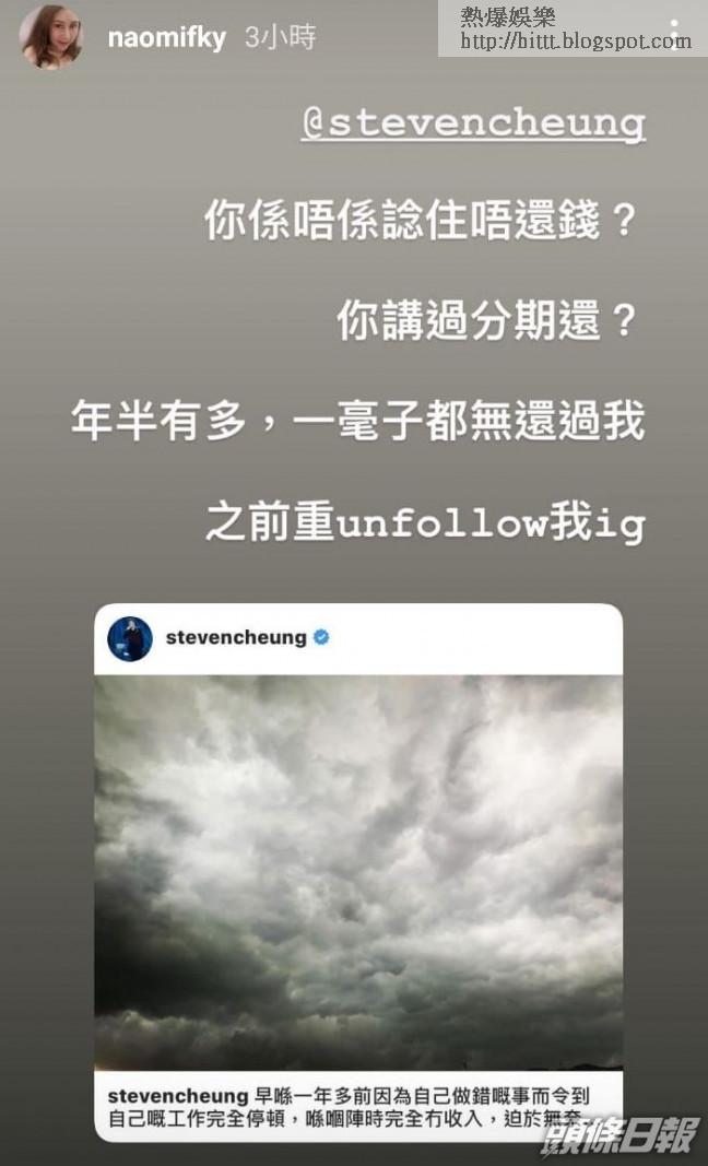 早前張致恒(Steven)被𡃁模Naomi(馮鎵瀠)一度追債,上月更被爆於居住的元朗遭貼街招追數,繼揭發一家搬離兼失聯,Steven老婆區燕雯(雯雯)還清空社交貼文。事隔半個月,昨晚她突然再度「蒲頭」,貼出勁長文點名狠批Naomi。首先雯雯感謝對方借二萬元應急,且為遲還錢致歉,但卻澄清並非消失走數。