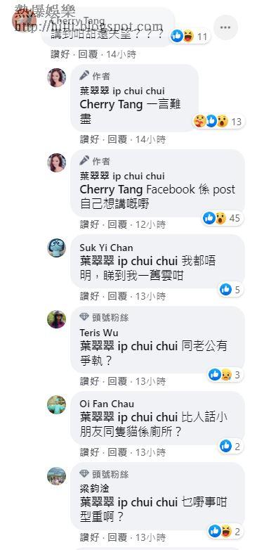 翠翠的留言一出,迅即惹來不少網民留言,有人問:「講到咁甜還失望?」翠翠回覆說:「Facebook係post自己想講嘅嘢。」接着又有人問是否與老公有爭執?亦有人提議她做運動舒壓,她說:「已經唞咗足足3日先出呢個post。」不過翠翠未有透露詳情,事後《蘋果》曾向翠翠了解,但她未有回覆。