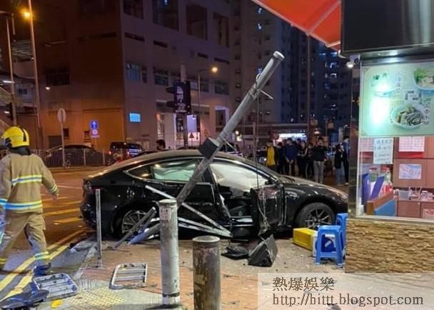 屯門Tesla撞柱掃欄剷行人路 外籍司機頭傷被困 #Tesla