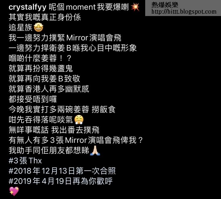 馮盈盈更表示正在努力撲Mirror演唱會飛,寫道:「我一邊努力撲緊Mirror演唱會飛,一邊努力捍衛姜B喺我心目中嘅形象。嗰啲什麼姜蓉!?就算打扮得幾盞鬼,就算再向我姜B致敬,就算香港人再多幽默感,都接受唔到囉!今晚我實打多兩碗姜蓉撈飯食,咁先吞得落呢啖氣。冇咩事嘅話我出返去撲飛。」雖然馮盈盈自稱「姜糖」,努力撲火,但一班姜糖仍然唔收貨,繼續留言鬧爆:「收皮世界女」、「笑完人,喺度扮冇事?」