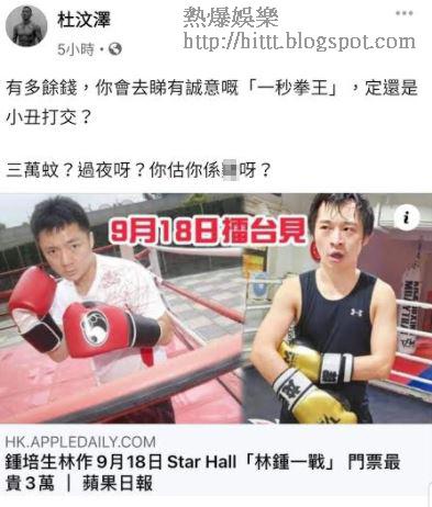 鍾培生與林作口水戰真正打上擂台,「林鍾一戰」已落實9月18日於九展Star Hall決戰,當日預計可安排1,800名觀眾入場欣賞,票價由1,200元至3萬元。報道一出,杜汶澤今天在facebook分享《蘋果》的相關新聞,並寫道:「有多餘錢,你會去睇有誠意嘅《一秒拳王》,定還是小丑打交?三萬蚊?過夜呀?你估你係X呀?」