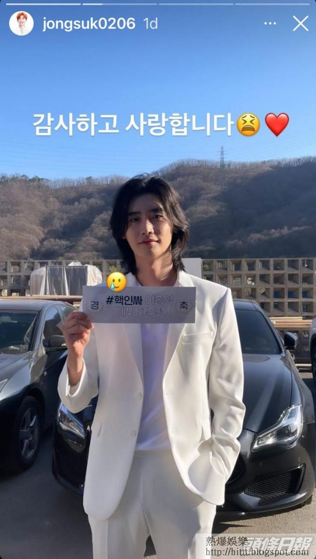 韓國男星李鍾碩在10年以韓劇《檢察官公主》開始演員生涯,近日迎來出道11周年。李鍾碩昨日在限時動態以韓文留言:「感謝,愛你們」,相片包括他手持粉絲製作的手幅,認證應援;他又大晒粉絲的禮物,有花束、蛋糕、親筆信等等,相當幸福。李鍾碩又與一個寫有「LEE JUNG SUK'S 11TH」字樣的「油畫蛋糕」自拍,唔知係邊位粉絲咁幸運呢?之前有指李鍾碩將客串電影《魔女2》,好期待今年初退伍的他復出!