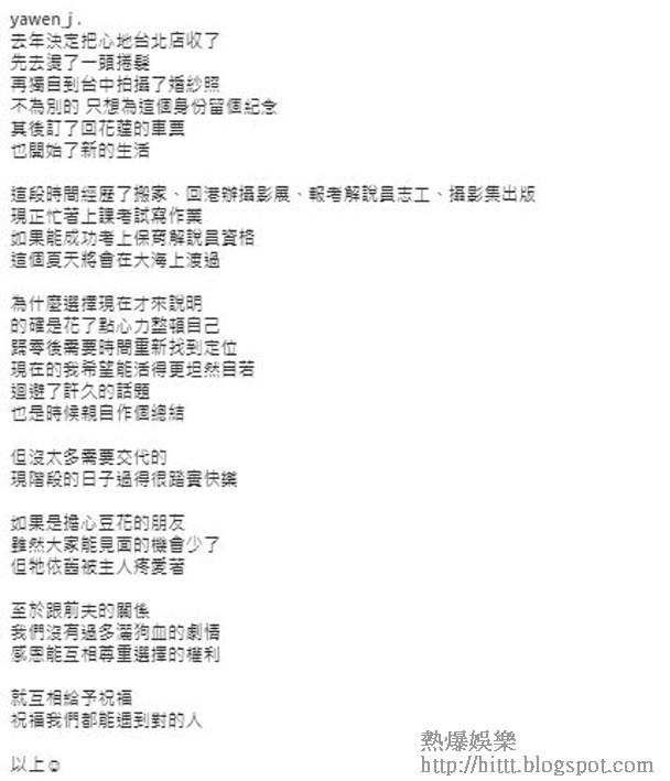 藝人蔣雅文早年遠赴台灣發展,並在2014年下嫁台灣老公朱經維,在當地落地生根,惟今日她突然在社交網發文宣布離婚,結束7年婚姻。她上載一張着上婚紗的背影獨照,透露早前特意回台中拍攝照片,紀念曾經作為「人妻」的身份,及後返回花蓮開始了新的生活,她又交代現況:「這段時間經歷了搬家、回港辦攝影展、報考解說員志工、攝影集出版,現正忙著上課考試寫作業,如果能成功考上保育解說員資格,這個夏天將會在大海上渡(度)過。」