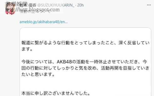 昨晚她在Twitter宣布停工,她留言:「對於自己的輕率行為,令各位粉絲、工作人員做成影響及擔心,真的非常抱歉。」原定下月有公開演出的鈴木優香,將會暫停在AKB48的所有活動,其社交網亦會暫停更新,有機會恢復活動時,再作另行通知。