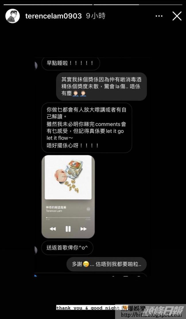 至於Anson Kong(AK、江𤒹生)憑《蝸牛》合唱版與Ian齊齊奪十大歌曲獎,AK在社交網發長文多謝MIRROR、《蝸牛》製作團隊、工作人員、粉絲及家人,他特別鳴謝Ian創作《蝸牛》送給他,更自爆二人經常鬧交,不過感情依然好好,言詞懇切。林家謙贏得6個獎項,包括「男金」,不過在頒獎禮上的態度就惹來部分網民抨擊。他事後解釋並非因為有塵才抹獎座,而是擔心消毒酒精會「乸到」,對獎座相當珍惜。