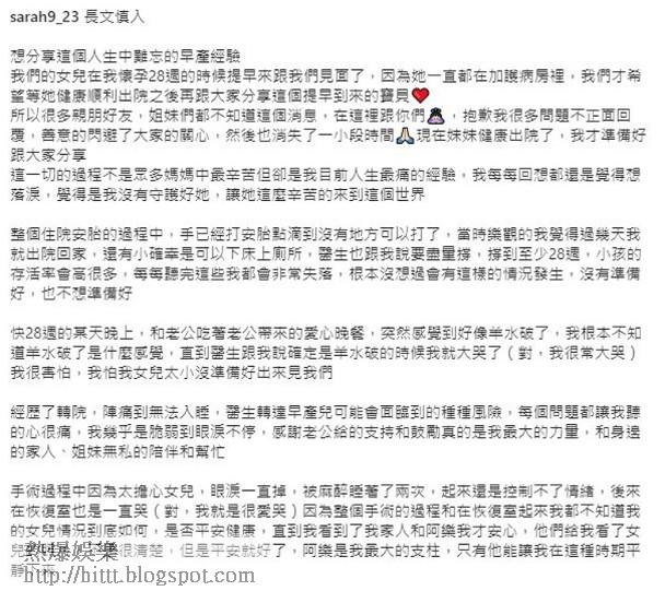 佢續指第1次見到B女時,其體重只有1kg(約2.2磅),頭部亦只有1個拳頭大小,身體插滿喉管,令佢兩公婆都極為心痛,又透露一直都好堅強嘅老公都忍唔住一直喊。最後佢多謝家人、朋友嘅關心及照顧,並特別感激老公嘅扶持:「最重要的是一直給我力量的老公,我們就像兩塊拼圖,不一樣卻完美契合,謝謝你讓脆弱的我堅強走過這一段,謝謝你這麼勇敢的陪伴我,謝謝你愛我,我們會一起好好疼愛這個太想跟我們相見然後提早出來的女兒。」