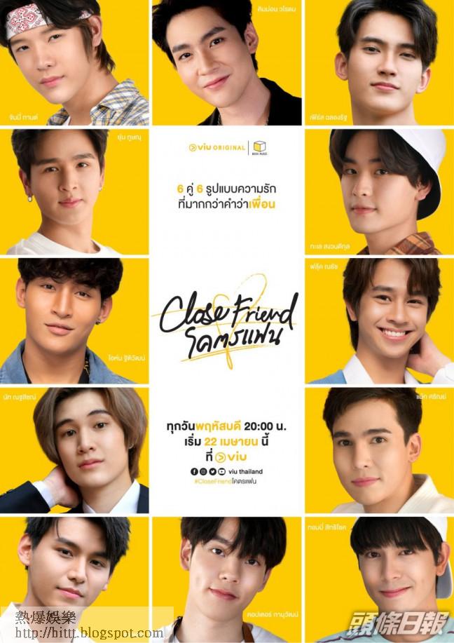 泰劇《Close Friend》亦是近期BL重頭劇之一,由12位演員演繹6個獨立浪漫故事。「Ohmfluke」CP的《Pretend To Love》講述拍拖3年的Pierce(Ohm飾演)與Typhoon(Fluke飾演),因為Pierce畢業,令他與仍是大學生的Typhoon感情出現變化。