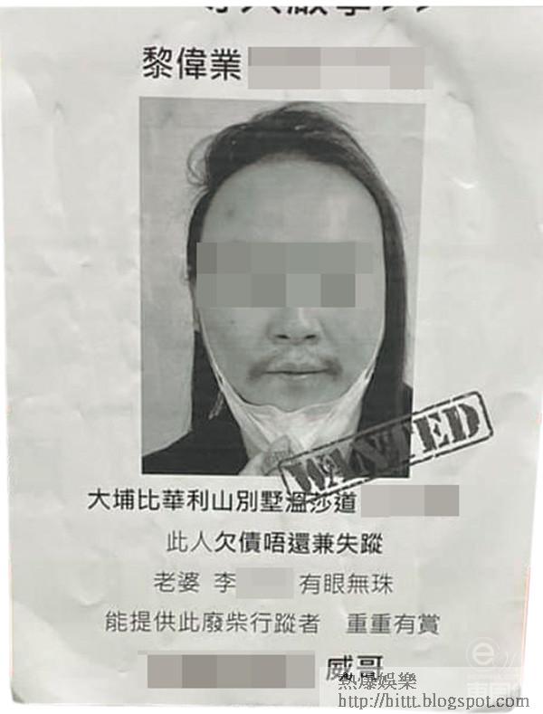 早前,黎偉業被指欠債的街招,貼滿整個比華利山別墅屋苑的內外,就連大埔市中心和網上的老千網都有,部份更有他身份證及一家四口的照片。
