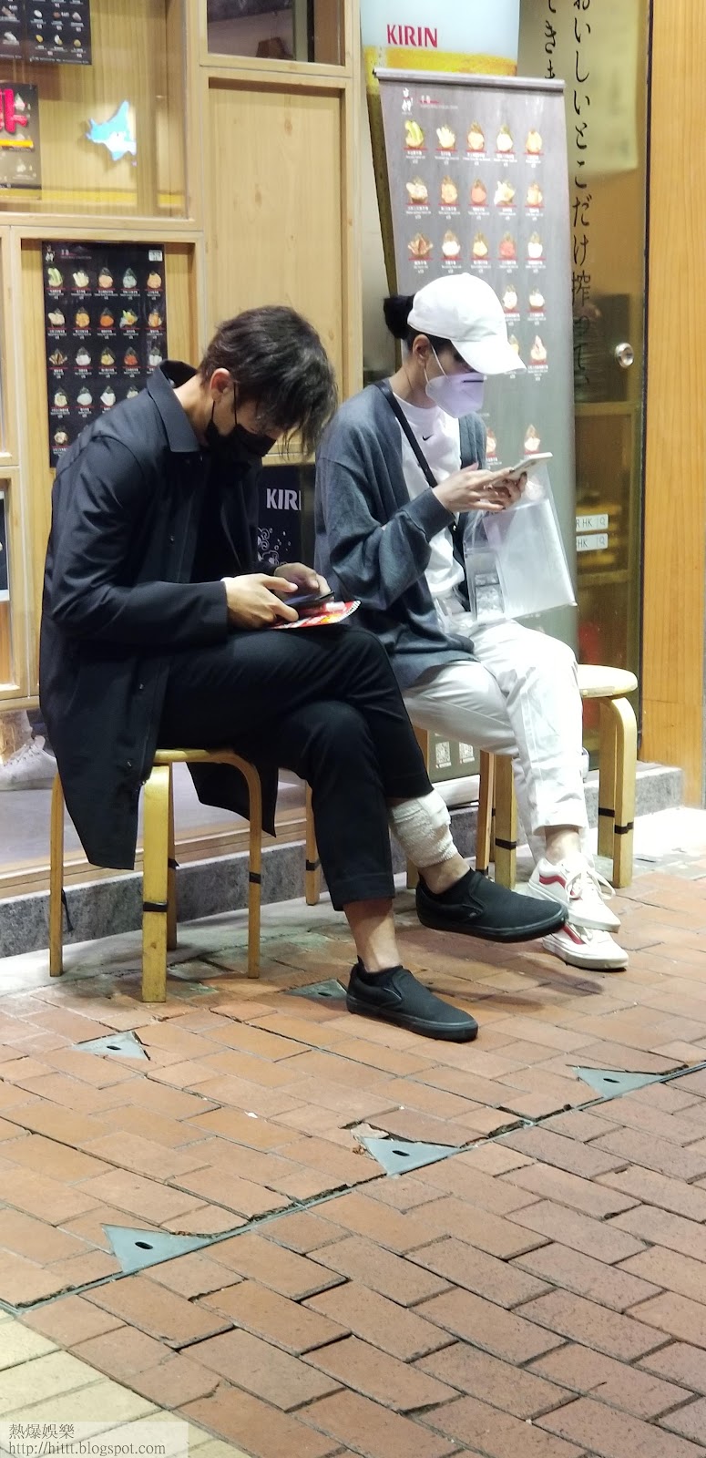 上個月政府放寬堂食時間,令很久沒有外出食飯的香港人,紛紛到外邊用膳,令飲食業得以倖存。Shaun同太太任祉妍亦把握機會,早前傍晚約7時許,見到他們坐在旺角一間立食壽司店門外等位。Shaun全身連口罩都作全黑打扮,而右腳紮了厚厚的繃帶,太太除了外套外,全身連帶cap帽都是白色。他們坐在門外等候時,各自玩起手機,每次店員出來叫輪候號碼時,太太都會順便問一下自己的輪候次序。反而Shaun較沉着,不像太太般心急。