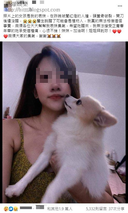 日前一位陳姓女網友心痛的表示,自己的表妹發生了重大車禍,遭闖紅燈的人撞上,導致頭蓋骨破裂,目前雖然開刀了但還沒醒,而醫師也說明醒了之後也可能會是植物人,讓家人都相當難以接受,希望大家能幫忙集氣,祈禱她早日康復。