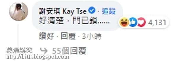 怎料此舉,觸動了謝安琪神經,她留言:「好清楚,門已鎖……」網友見到留言,紛紛留言給Like,笑言阿聰再次激嬲老婆,回家門有難度!有的笑言謝安琪的留言夠晒押韻,叫她挑戰填詞!