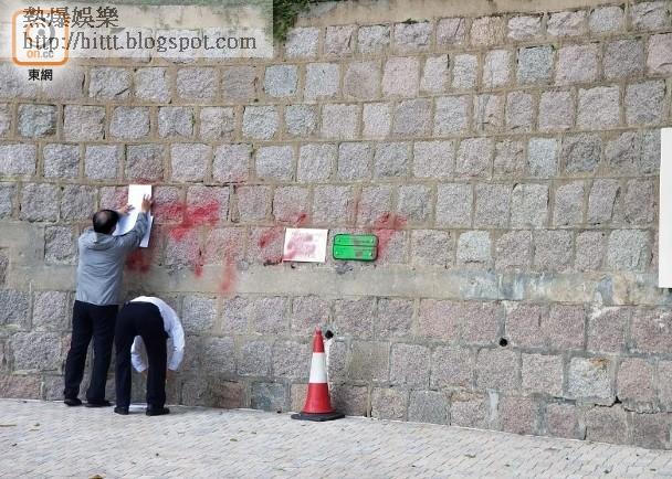 大宅外石牆被油漆噴污。(趙瑞麟攝)