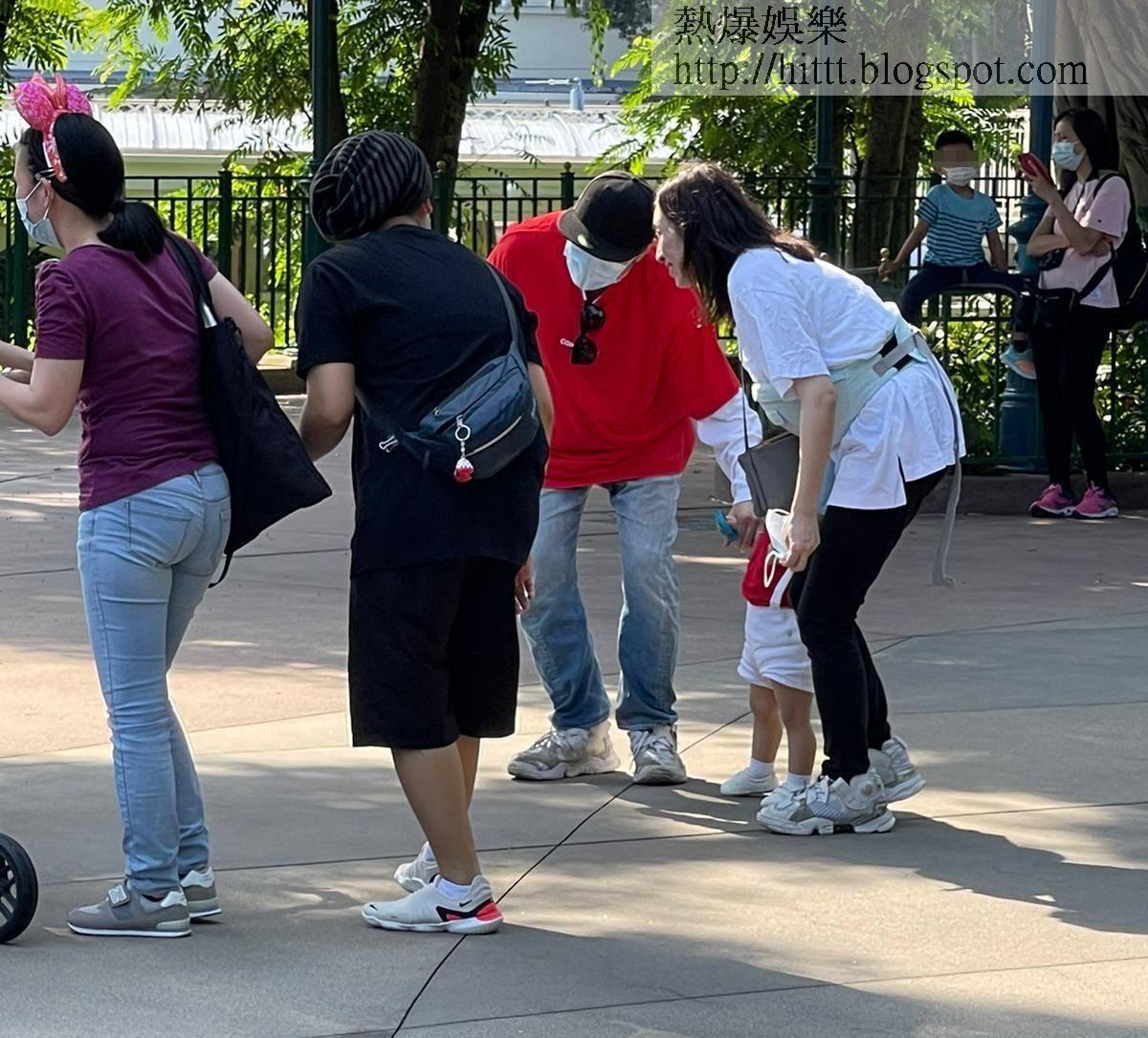 日前《蘋果》讀者蔡小姐透過「爆相爆片」,分享她在迪士尼樂園遇到基仔一家的照片。蔡小姐說:「嗰日見到基仔兩公婆帶住囝囝,旁邊仲有三個外傭同幾個大人,一群人浩浩蕩蕩喺樂園入面行嚟行去。見佢哋好少玩機動遊戲,反而主力喺唔同園區影好多相。基仔除咗自拍,又會叫其中一個中年女人幫手揸機影相,不過最好笑係嗰三個外傭姐姐,見佢哋又跳又扮鬼扮馬,好落力𠱁基仔個囝影相。囝囝食嘢嗰陣,啲大人又輪住喺佢身邊,一個抱實,一個餵嘢食,另一個就𠱁佢開心,幾個大人圍住個小朋友氹氹轉,見到佢哋真係好錫個小朋友。」雖然有外傭姐姐幫手,但從蔡小姐提供的相片所見,媽媽Lorraine大部份時間都用揹帶抱實Kuson,至於當日和囝囝穿上紅色Tee父子裝的基仔,影相時就負責引囝囝望鏡頭。