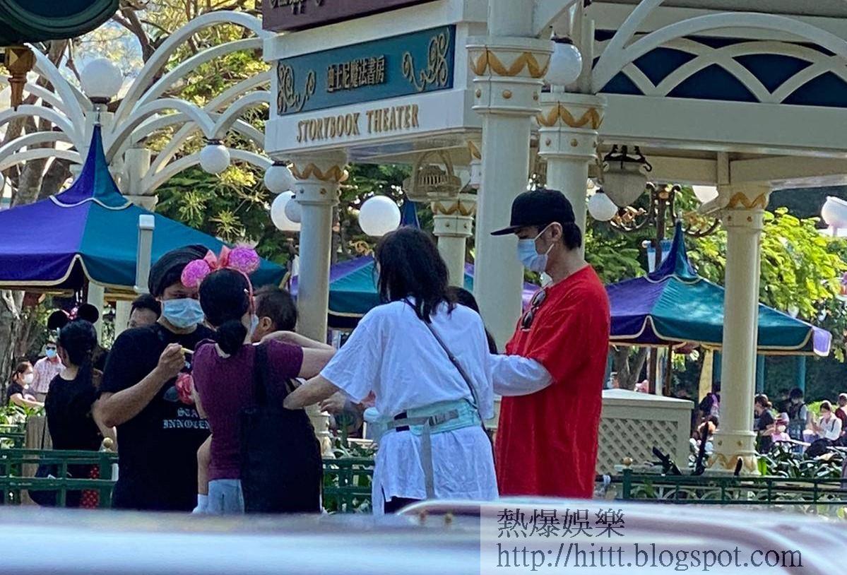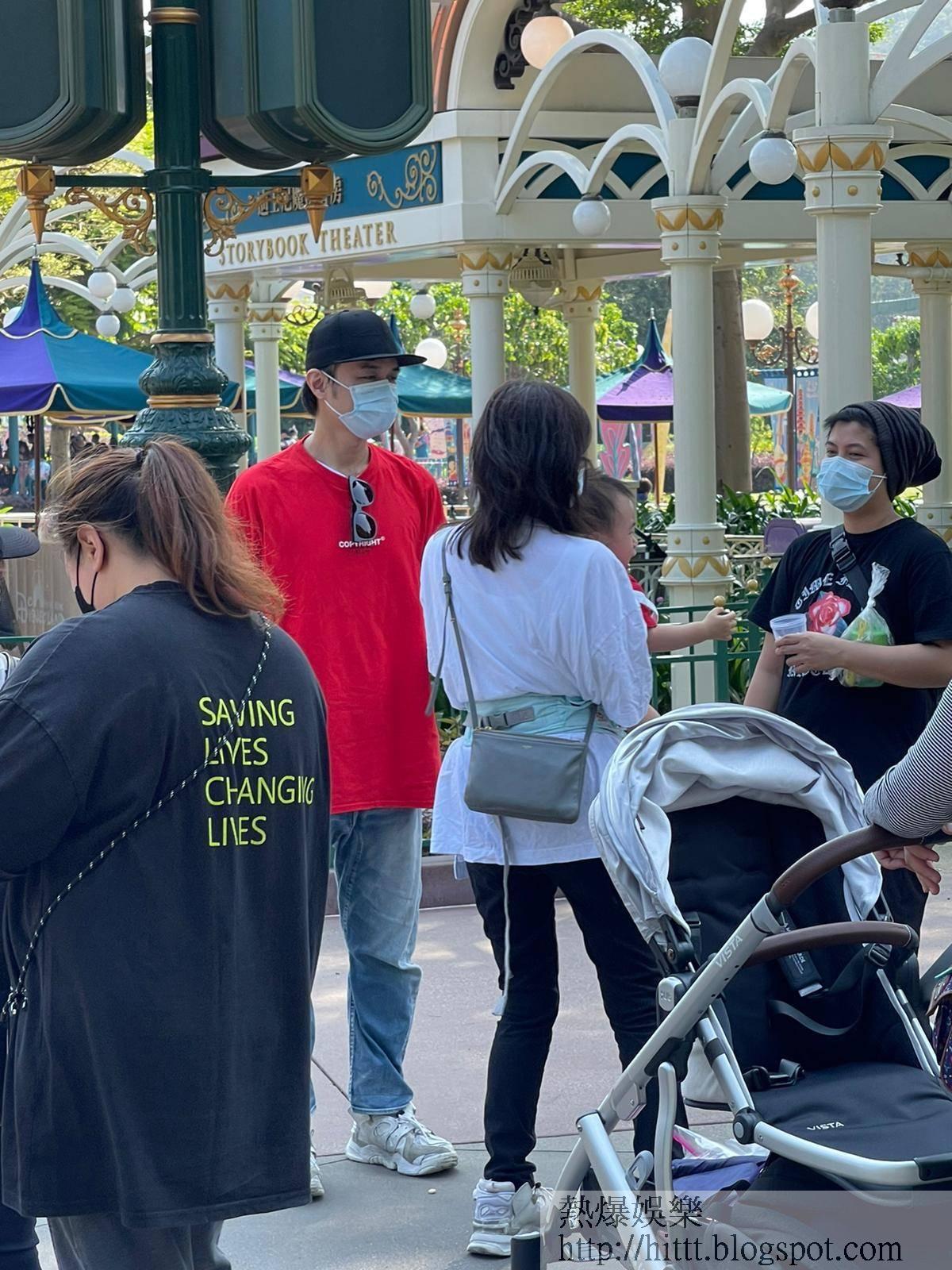 日前《蘋果》讀者蔡小姐透過「爆相爆片」,分享她在迪士尼樂園遇到基仔一家的照片。蔡小姐說:「嗰日見到基仔兩公婆帶住囝囝,旁邊仲有三個外傭同幾個大人,一群人浩浩蕩蕩喺樂園入面行嚟行去。見佢哋好少玩機動遊戲,反而主力喺唔同園區影好多相。基仔除咗自拍,又會叫其中一個中年女人幫手揸機影相,不過最好笑係嗰三個外傭姐姐,見佢哋又跳又扮鬼扮馬,好落力𠱁基仔個囝影相。囝囝食嘢嗰陣,啲大人又輪住喺佢身邊,一個抱實,一個餵嘢食,另一個就𠱁佢開心,幾個大人圍住個小朋友氹氹轉,見到佢哋真係好錫個小朋友。」雖然有外傭姐姐幫手,但從蔡小姐提供的相片所見,媽媽Lorraine大部份時間都用揹帶抱實Kuson,至於當日和囝囝穿上紅色Tee父子裝的基仔,影相時就負責引囝囝望鏡頭。