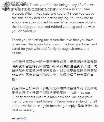林德信(Alex)昨晚於IG分別以中、英文撰長文悼念剛離世的公公,Alex細訴跟公公相處的溫馨畫面,他寫着「公公我好感恩你一路一直陪着我成長。細個嘅時候當我瞓唔到覺,你會坐喺我床側邊拍拍我隻腳,直到我入睡。每日送我返放學,煮好多嘢畀我食。到你變老嘅時候有病,我就坐喺你張床側邊幫你做按摩,每個禮拜日就會同你食飯。」
