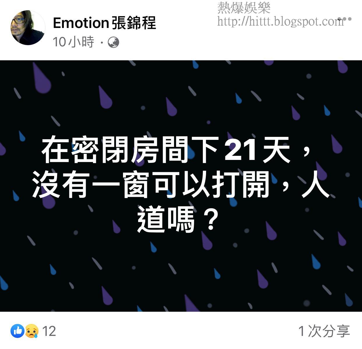 武漢肺炎疫情似乎受控下,香港人生活漸漸回復正常生活,不過由外地返港的旅客,仍需要在指定檢疫酒店隔離21日。張錦程今日曾在facebook透露正接受隔離,又說:「在密閉房間下21天,沒有一窗可以打開,人道嗎?」