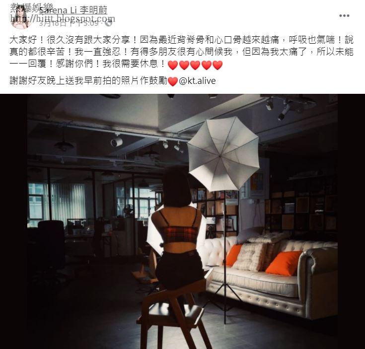 Sarena月中曾在facebook表示背脊骨和心口骨越來越痛,呼吸也氣喘而感覺好辛苦,當時表示需要休息的她,因為未能回覆慰問她的人而致歉。事隔13日,Sarena今日在facebook透露自己因為身體出現劇痛而入院,更指安頓好後會再向大家報平安。